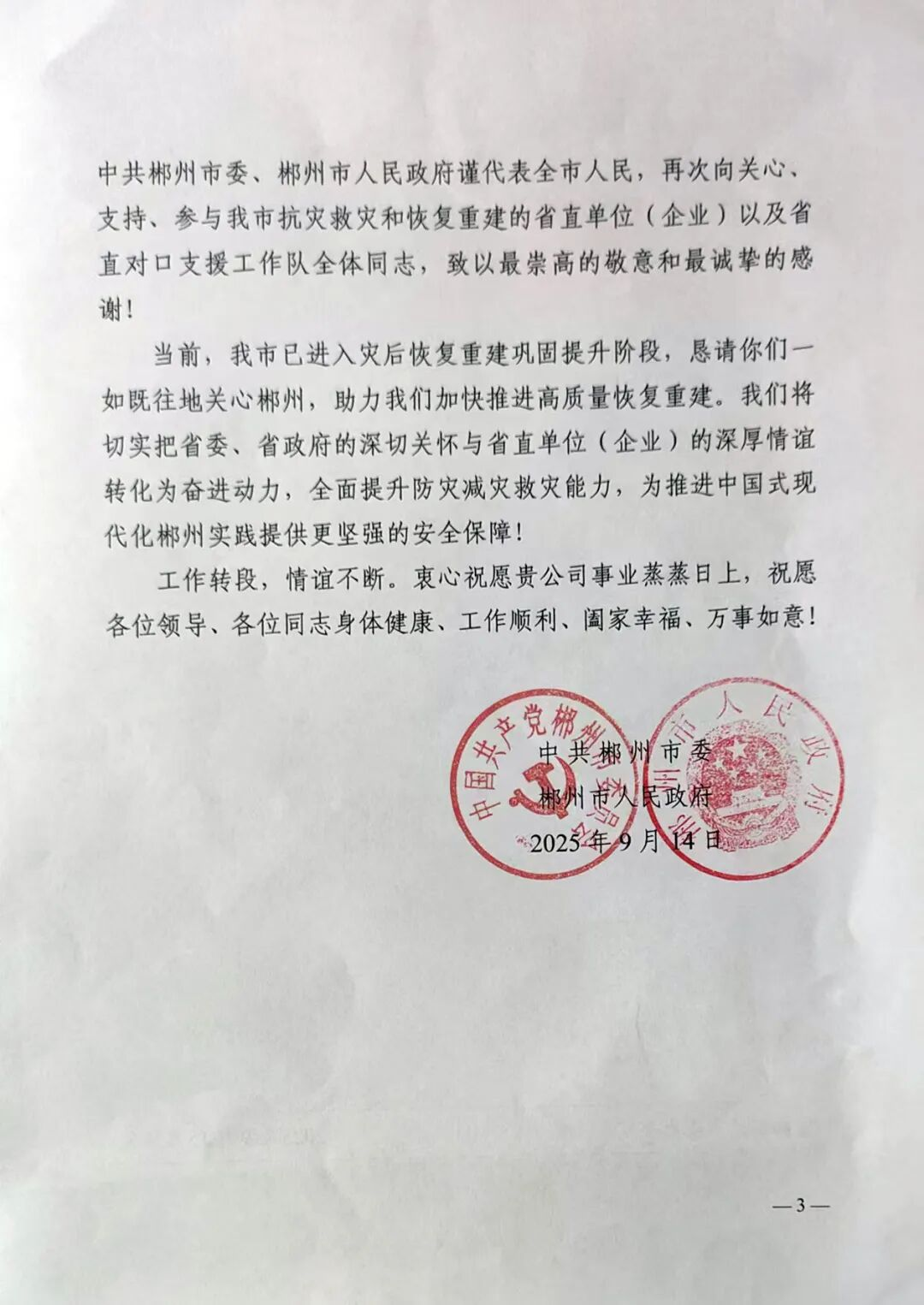 ? ? ? ?近日,郴州市委、市人民政府發(fā)來一封情真意切的感謝信,再次向關心、支持、參與抗災救災和恢復重建的湘電集團及工作隊全體隊員,致以最崇高的敬意和最誠摯的感謝!